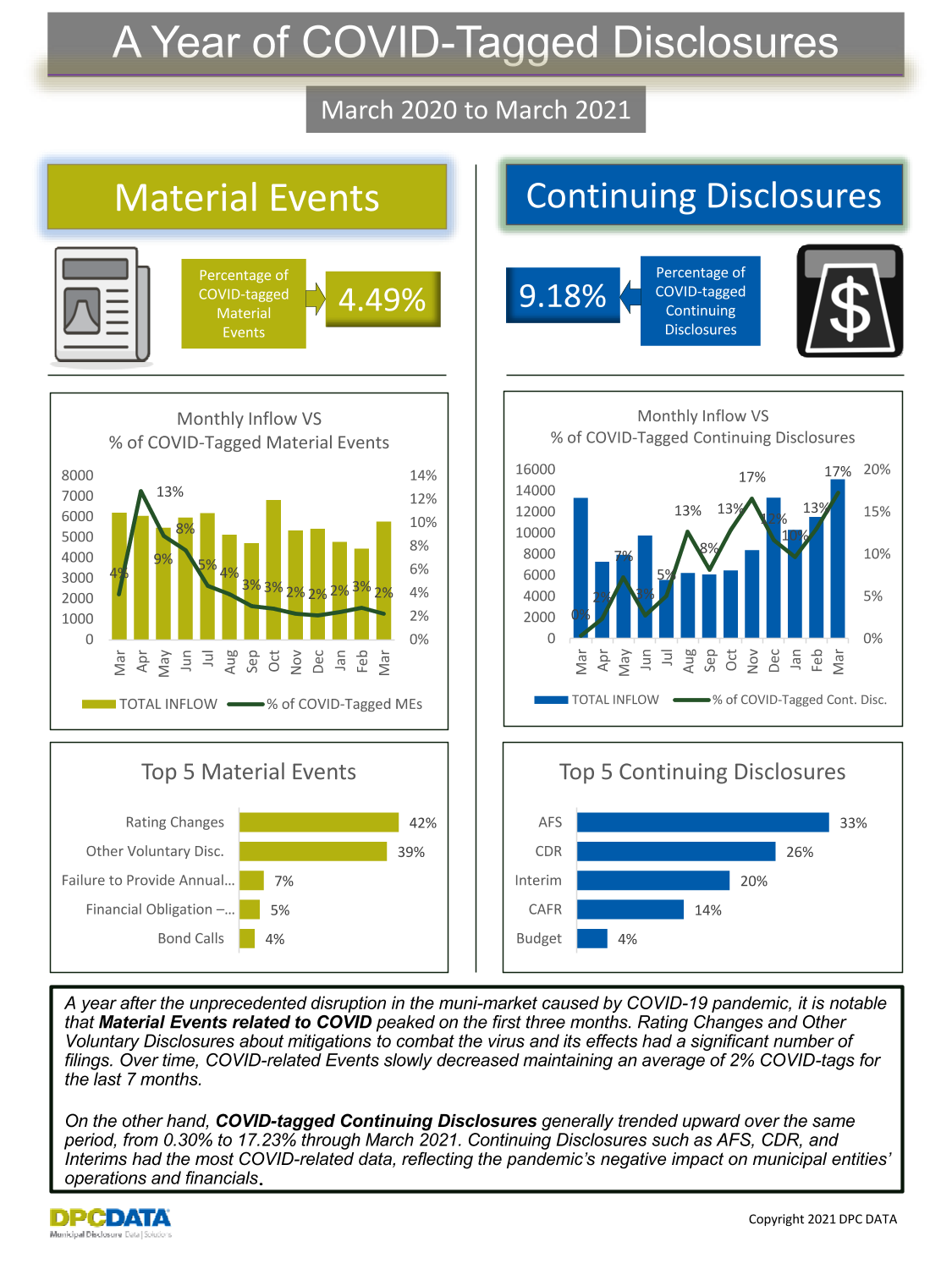 In a new monthly infographic, we will be looking at trends in COVID-19 disclosures for material events and continuing disclosures. We start here with a summary from the pandemic's 2020 inception to March 2021.